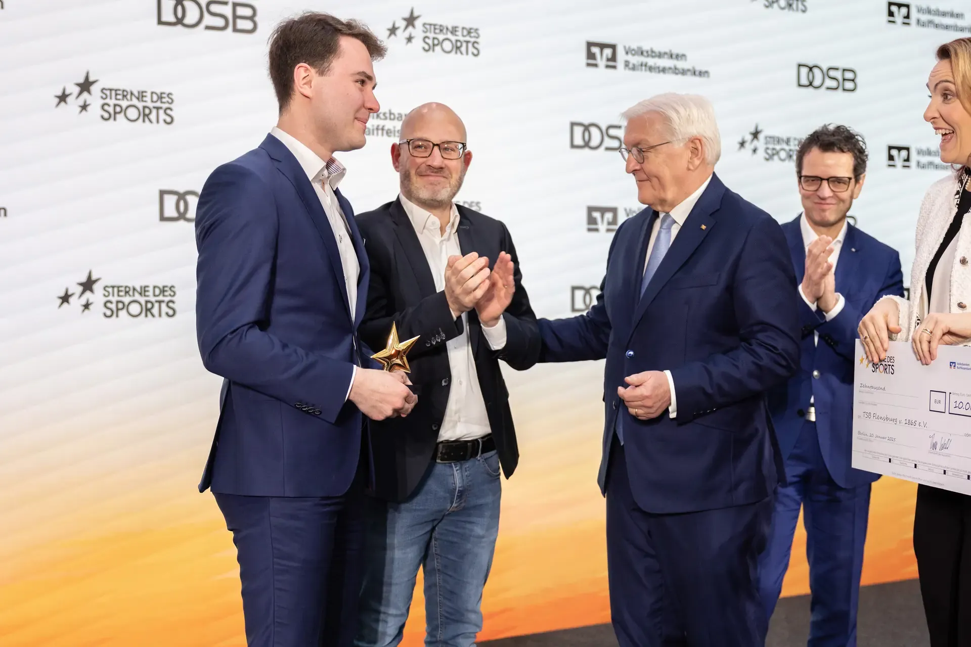 Dieses großartige Projekt hat nicht nur bei uns in der VR Bank Nord überzeugt. Nach der Auszeichnung auf Ortsebene durften wir die jungen engagierten Sportlerinnen und Sportler nach Kiel zum Landesfinale und nach dem erneuten Sieg dann nach Berlin zum Bundesfinale begleiten. Bei der Goldpreisverleihung im Januar setzte sich der Verein gegen alle Landessieger der anderen Bundesländer durch und erreichte den 1. Platz und den „Großen Stern des Sports“ in Gold, der von Bundespräsident Frank-Walter Steinmeier überreicht wurde.